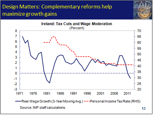 For example, in Ireland in the late 1980s, wage moderation was important to restore competitiveness and create jobs. The road to real wage growth reductions was paved by personal income tax cuts that mitigated the impact on disposable income. And tax cuts were made possible by expenditure-based fiscal adjustment.