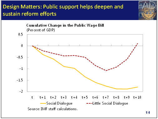 Here is another example of the role of public support. This chart shows that public wage bill reductions involving social dialogue were typically larger and more sustained than otherwise.