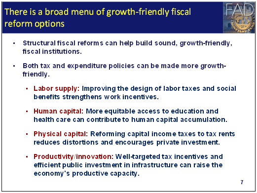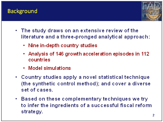 Today I will present a recent study by the IMF’s Fiscal Affairs Department (FAD) that explores how fiscal policy affects medium- to long-term growth.