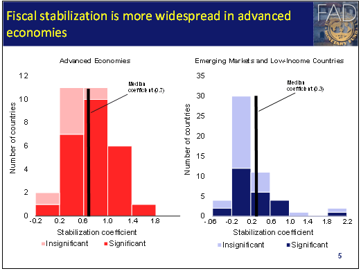 As you can see in the charts, fiscal stabilization appears to be higher among advanced economies than among emerging markets and low-income countries. The median FISCO among advanced economies is 0.7; and only 0.3 among emerging market and developing economies.