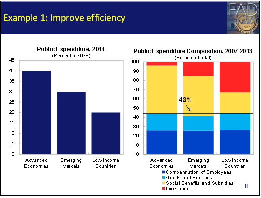 As you can see on the left chart, total spending in advanced economies reached more than 40 percent of GDP in 2014. This figure is just above 30 percent of GDP for emerging market economies and 20 percent of GDP for low-income countries.