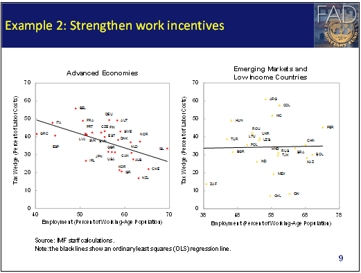 The figure on the left shows that in advanced economies the labor tax wedge is negatively correlated with employment.