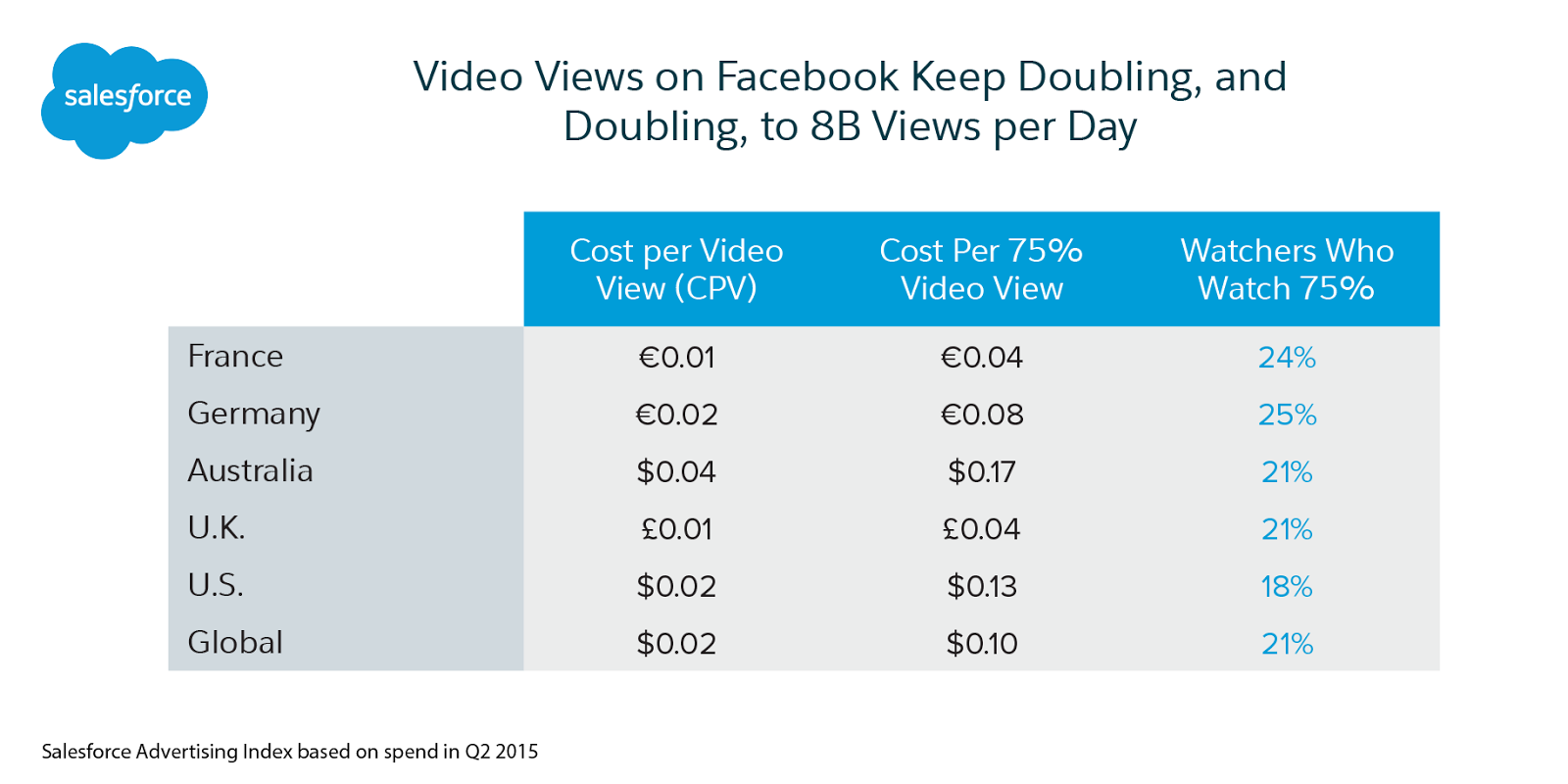 For video ads optimized for views across five key markets, it cost \\$0.02 for each three-second video view. It cost \\$0.10 for people to watch 75% of the video; 21% of the people who started watching the video watched 75% of it. Video view costs ranged from €0.01 in France to AUS \\$0.04 in Australia.