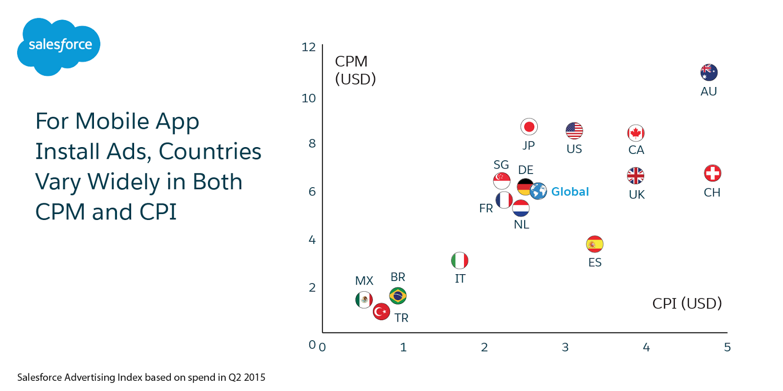 Mobile app advertisers tend to run multi-region campaigns in which they are strongly focused on which markets deliver effectively priced app installs of customers who produce a true ROAS. Different European countries have very different CPIs, ranging from a high of \\$4.82 in Switzerland to \\$1.69 in Italy. Mexico and Brazil are less expensive for app installs than any European country except Turkey.