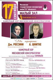 ОРЕАНДА-НОВОСТИ. 17 сентября 2013 года, во вторник в 19.00 в Малом зале Московской Государственной Консерватории имени П.И. Чайковского состоится концерт "Два портрета: Дж. Россини и А. Шнитке" в рамках абонемента №27 "Камерный хор Московской Консерватории". Дирижёр - Александр СОЛОВЬЁВ.